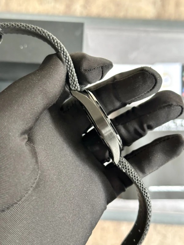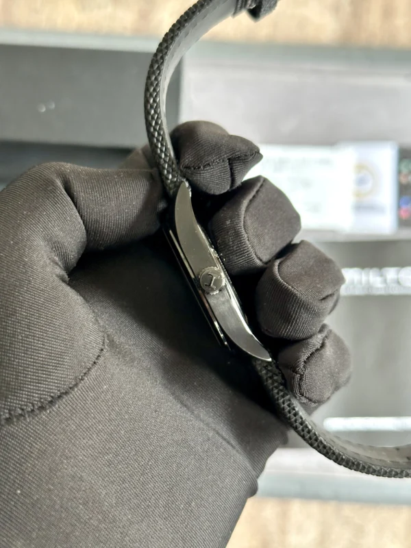 Case is made of stainless steel with black PVD coating along with black fabric/silicone strap. Case size is 40mm and case thickness is 9.6mm. In addition, Case back is closed. Band size is 20mm. Sapphire crystal/glass. Classic black color inner dial with luminous hands and hour markers. Swiss quartz movement. 50 meters water resistance.