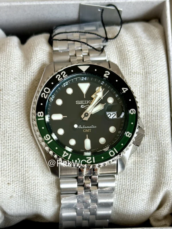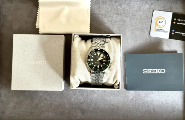 Seiko 5 Sports GMT Automatic Green Dial Men SSK035K1 42.5mm is in brand new condition with box, tag and warranty card from Seiko (See Pictures for Packaging). For better representation of condition please check the additional photos listed. Seiko Automatic GMT Green SSK035K1 comes with Seiko branded box, tag, warranty card and 1 year of Seiko official movement warranty. Warranty card is dated 18-09-2025.