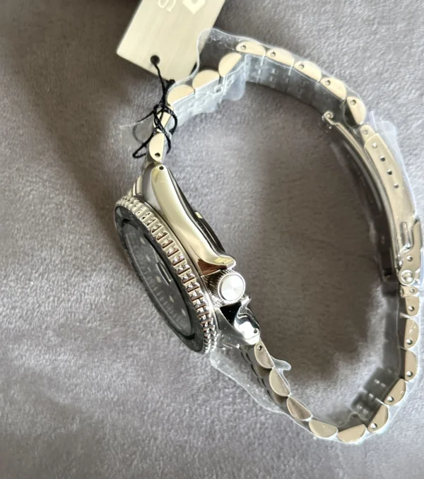 Case and bracelet is made of stainless steel. Case size is 42.5mm, 46.0mm lug to lug and case thickness is 13.6mm. In addition, Case back is see-through. Band size is 22mm. Pull-Push crown. Hardlex crystal/glass with lens on date side. Beautiful green color inner dial with yellow gold color GMT hand along with date window at 3 position. Uni-directional stainless steel rotatable bezel with two one black/green bezel insert. 4R34 automatic movement with manual winding capacity. Seiko Automatic GMT Green SSK035K1 has 10 bar water resistance.