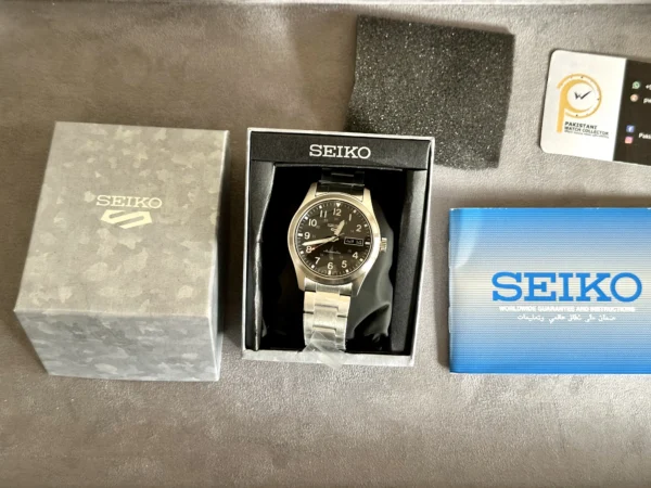 Seiko Seiko Sports Field Black Dial Automatic Men SRPG27K1 39.4mm is in brand new condition with complete box, tag and papers. Watch comes with Seiko branded box, tag and warranty card. Comes with 1 year of Seiko official movement warranty (Card Dated 18-09-2025)
