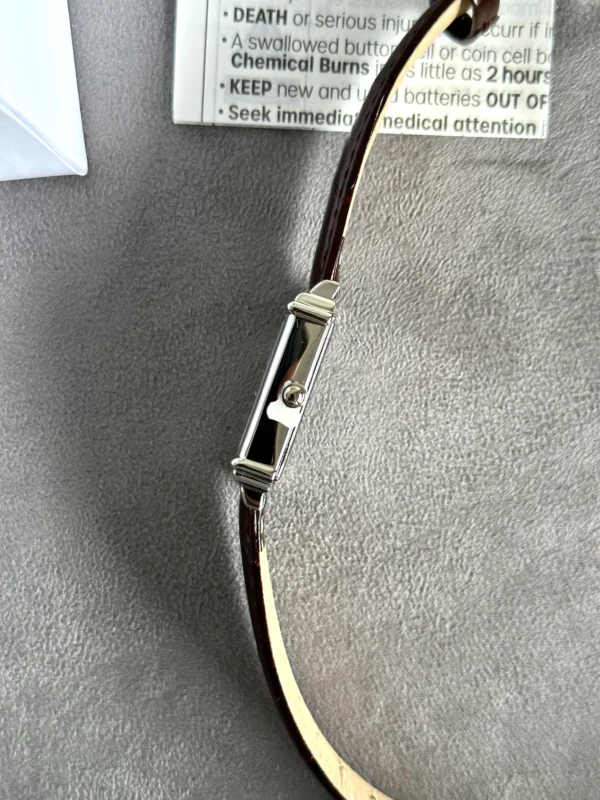 Case is made of stainless steel along with brown color leather strap. Case size is 25mm, 37mm Lug to lug and case thickness is 8mm. In addition, Case back is closed. Band size is 18mm. Mineral crystal/glass. Classic white color inner dial with roman style hour numerals. Big moon phase display along with a date window at 6 position. Japanese quartz movement with moon phase and date complication. 50 meters water resistance.