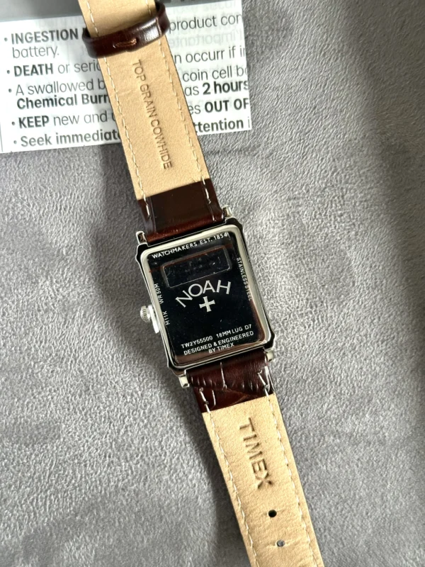 PakWC presents Timex Noah Tank Moonphase Silver Case Quartz Men TW2Y55500. The Noah × Timex Moon Phase partnership combines affordable watchmaking with classic style. Inspired by the rectangular “tank” design, it has a stepped case made of warm gold-toned leather or polished stainless steel with a crocodile-patterned leather strap.