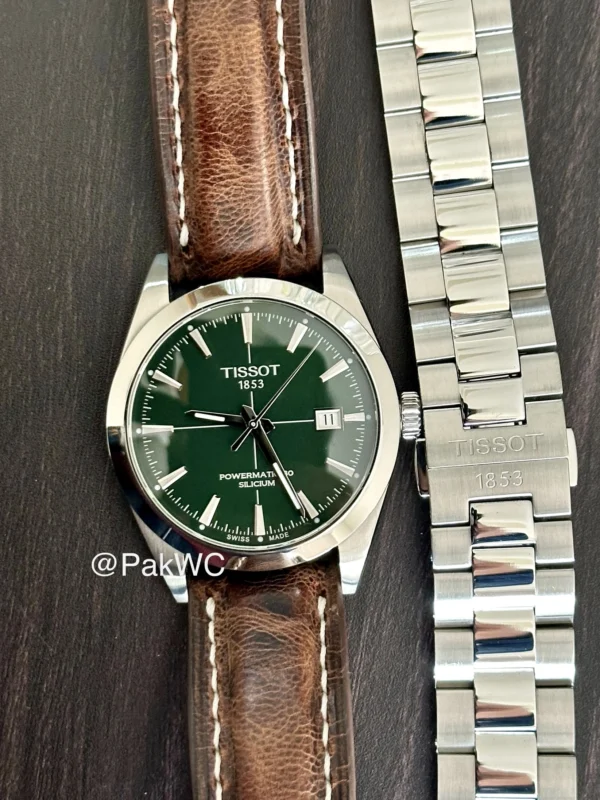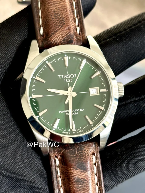 PakWC presents Tissot Gentleman Green Cross Hair Dial Powermatic 80 Men T127.407.11.091.01 40mm. The most beautiful and in demand sun burst cross hair green color inner dial under Gentleman series by Tissot. A sophisticated Swiss-made automatic watch, the Tissot Gentleman Powermatic 80 Silicium strikes a mix between traditional elegance and cutting-edge engineering. With a domed sapphire crystal with an anti-reflective coating and a 40mm 316L stainless steel case, it has a stylish and adaptable design that works well in both formal and informal settings. Its Powermatic 80 movement, which has a remarkable 80-hour power reserve and a silicon balance spring for improved accuracy, durability, and magnetic field resistance, is its most notable feature.